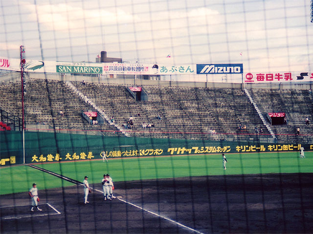バックネット裏から左側、3塁ベースを経てレフト方向を見ています。高島屋のポールを境にして、どちらかというと無機質な感じでそびえるレフト・スタンド・・・。同じ外野スタンドでも、ライトスタンドとは全然雰囲気が違いますね。グラウンド・ウォールの広告には、ほんの僅かに赤みが入った鮮やかな黄色が使われていたのも、大阪球場の特色です。