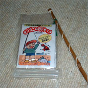 同社観賞魚事業部・中村氏の話によると、この商品に関する企画は、イベント系会社やホームセンター関係の卸業者などを中心に、昨夏ごろからオファーが来ていたとのことで、商品の位置づけとしては「自然学習教材」ということになるらしい。当然、対象も私たちキーパーではなく、これからザリガニと触れ合おうとする子どもとか家族とかいう感じになろう。竿にタコ糸が留められていて、竿の先には、右の写真にあるような釣り餌(スルメ)と説明書(飼育方法など)、さらには飼料(餌の感じからするとプレミアムあたりか?)までついていて、これさえあれば、すぐにでも釣りができ、家に持ち帰って飼育できるようになっているところがミソ。価格はオープン(実勢600円程度)とのことで、6月中旬より順次出荷されているそうだ。