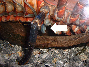 右の写真が、繁殖に適するオス個体を、側面から写真です。白い矢印の先、第5胸脚の基部にしっかりとした突起が出ているのが見えるでしょう。品のないキーパー間で言われる「いいチンチンのオス」とは、普通、こういう状態の個体を指すのです。マロンはパラスタシダエ科に属するザリガニですので、キャンバリダエ科やアスタシダエ科諸種のように、第1腹脚が肥大化して生殖器の役割を果たすことはありません。あくまでも、第5胸脚基部に突起ができるだけです。この突起は、個体によっても差が出てきますが、連続して何度も繁殖に用いたり、個体自体が近親交配などで弱化していたりしますと、充分に出てきません。これを一般的に「擦り切れ個体」と呼び、25センチ程度の青個体(ブルーマロン)には、比較的多く見られます。これは、こうしたサイズの個体になると、ブリードの段階で何度か繁殖に使ってから出荷されることが多いためであろう・・・と言われています。その反面、最初から種親用と商品用とに分けて育成する食用ルートの原色個体には、逆に「いいチンチンのオス」が多い・・・ということになり、実際、種親オスには、意図的にこうした個体を用いるケースが多いようです。