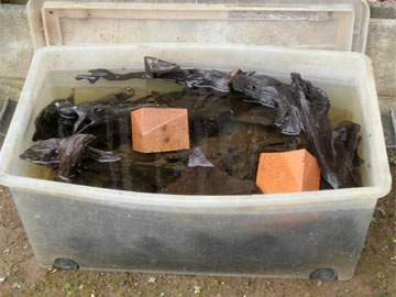 ザリガニ飼育の水槽立ち上げにおいて、この「流木の仕立て」は、水作りと同じくらい大切で、かつ時間も手間も掛かるものです。流木は、レイアウトにもなり、シェルターにもなり、そして餌にもなる大切なものです。第2ステップでも触れましたが、ザリガニをある程度以上の水槽本数で長い期間に渡り飼育したいとお考えの方であれば、いざという時の水槽本数変更やセッティング変更に対応できるよう、常時何本かの予備流木を用意し、こうした形で漬け込んでおくことは、本当に大切だと思います。水槽自体のセッティング方法は数々あれど、様々な場面で、しかも様々な目的に活用できる流木の有効性は、キーパーのみならず、どのブリーダーでも共通したところだからです。