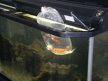 魚たちは、投入前に「お約束」の温度合わせをしましょう。「たかが金魚で・・・」と思うかも知れませんが、彼らには違った意味で、コンディションを崩されると困るのです。これも様々な意見はありますが、パイロットフィッシュの場合「水を作る」という使命上、水合わせはしないで投入するのが一般的です。となると、魚たちからすれば、それだけで充分なダメージとなるワケですから、せめて温度合わせくらいはしてあげてもよいハズ・・・ですよね。