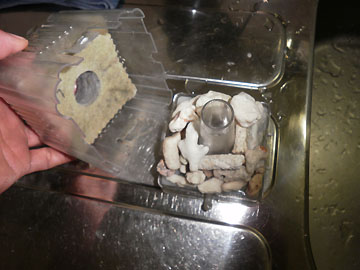 基本的には「送気」が目的ですので、ここで濾材として何を入れるかについては、特に大きな問題ではないのですが、ザリガニ飼育という点で、あえて特徴を出そうと考えてみた結果、ここにはサンゴ砂を入れてみることにしました。もちろん、フツーの大磯砂でもまったく問題ありませんし、特に何か特別な濾材を使わなければならないこともありませんが、やはり、水にある程度の硬さを持たせる方が有利なので、手軽にこれを実現できるサンゴ砂は本当に便利です。前回、上部濾過で投入した大粒のサンゴ砂を使ってみることにしましょう。
