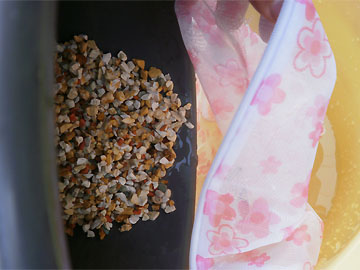 ゼオライトのみに限ったことではありませんが、こういう粒状濾材の場合、その後の管理(メンテナンス)をきちんと行なうことは非常に重要であり、そのためにも、セッティングにあたって出し入れをしやすくしておくことは必要不可欠です。そのため、バラバラに投入するよりも、袋などに入れてブロック単位化する配慮も必要でしょう。ショップに行けばこうした濾材を収納するための専用ネットも販売されていますが、左に写真のように、最近では、100円ショップでも様々なサイズや形の洗濯用ネットも販売されており、これを流用するのも1つの方法です。使用を予定している濾過槽のサイズや形に合わせて選ぶようにしましょう。なお、あまり過敏になる必要はありませんが、錆びの発生と溶出を避けるため、ファスナー部が金属ではなく、プラスチック製のものがあれば、なお好ましいはずです。充分に洗ったゼオライトは、右の写真のようにネットへと納めて行きます。