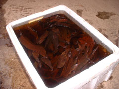 水の色をご覧下さい。完全な「茶色」に変色しているのがおわかりいただけますね。原理としては、流木のアク抜きと同じですが、1片1片が薄く、表面積が大きい上に、木片と違って内部の物質が外に溶出しやすい状態になっていますから、まるで上質のウーロン茶でもあるかのような色に変わります。