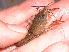 環境の変化に対応させるためか、スタート4日目にして、両方の個体が一斉に脱皮しました。ここでは、変化の見られた第二水槽の個体を取り上げてみましょう。変化と申しても、こちらが期待した「色の薄化」ではなく、通常の成長過程で見られる体色変化で、御覧の通り、胸脚先端に、アメザリ特有の赤色が発現し始めています。アメザリを稚ザリの段階から飼育した経験をお持ちの方であれば御存知かと思いますが、アメザリの場合、発色は頭胸甲や腹節などよりも、胸脚などの方が早く出てくるのが通例です。春仔が大きくなる9月ごろに採集へ出ますと「ハサミだけが赤いザリ」によく出くわすものです。 なお、今回の脱皮では、第1水槽の個体には脱皮殻をそのまま放置して食べさせ、第2個体の方は、直ちに取り除いてしまいました。これは、古い脱皮殻に含まれているカロチノイドを、個体に再摂取させないためです。この後、それぞれの個体がどう変化して行くか、本当に楽しみです。 | |