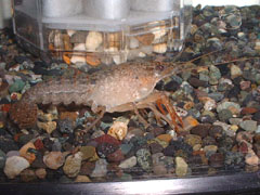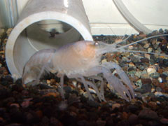 | 解説: 両者とも、採集できた中では最も小さい個体で、いわゆる「昨年の秋仔」という、生後半年くらいのものです。第1水槽の個体が全長約4センチ、第2水槽の個体は、それより心持ち大きい5センチ弱・・・といったところでしょうか? いずれも、泥質の水底で安全に生きて行けるよう、底質に合わせた褐色を身にまとっていますが、第1水槽の個体の方が、少々濃い褐色であることがわかります。なお、第2水槽の個体は、左側第5胸脚が、途中から欠損しています。 | |