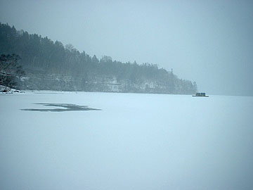 湖上へと目を移すと、相変わらず地吹雪が弱まったり、強まったり・・・。ちょっと風が強まると、湖の向こうにそびえている山も、すぐに見えなくなってしまいます。というより、真っ昼間のはずなのに、どうしてこんなにも暗いのか・・・。沖縄の血を引く私めには、恐怖感すら覚えてしまうこの空模様だったりするわけです。もちろん、せっかく勇気を奮って乗り込んできたのですから、ここで怯むワケには行きません。