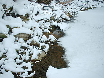 氷が砕けて水面が出ているのがわかりますが、底質をチェックしてみましょう。大小の礫に加えて、かなりの量の落ち葉が確認できますよね?