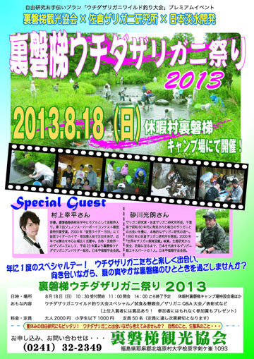 裏磐梯観光協会・日本淡水開発・佐倉ザリガニ研究所がコラボしたプレミアムイベントである「裏磐梯ウチダザリガニ祭り」も、今年で3回目を迎えました。元々は、震災によって大変な苦労をしている福島に、ザリ好きがたちが集まって笑顔の花を咲かせよう・・・という想いで企画されたものですが、地元の方々を始め、多くの方々のご理解とご協力をいただき、規模や内容も少しずつグレードアップしながら回を重ね、裏磐梯の夏を飾るイベントの1つに育ってきたことは、本当に嬉しいことでもあります。