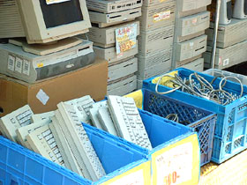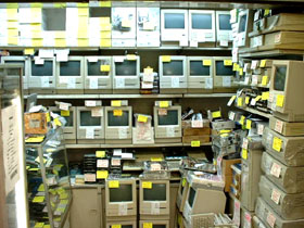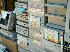 それでは、さっそくジャンクショップにトライしてみましょう。ジャンクショップとは、すでに申し上げるまでもなく、ジャンク物のパソコンや部品を販売するショップで、前項でも触れました通り、中央通り沿いのエリアではなく、一歩奥に入った通り沿いなどに点在しています。要は「とにかく目立たない!」ということ・・・。取り扱うマシンやパーツの種類・値段は、ショップごとに全く違いますし、同じショップでも、時期によって在庫の量も傾向もガラッと変わってしまうのが普通ですが、この写真のように、数年前ン十万円だったようなマシンの数々が、店頭に無造作に積み上げられていますから、注意して歩いていれば、通りに面したショップなら、すぐにわかるはずです。