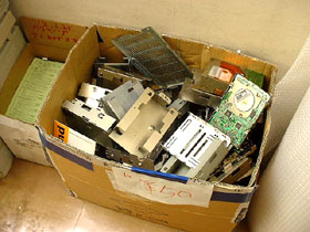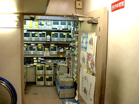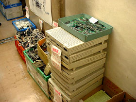 「ジャンクショップ」といえば、忘れてはならないのが、この「地べた置き」の商品群でしょう! マシンや筐体なんかはもちろんのことですが、ケーブルやキーボード、そしてパーツなどが、ダンボール箱や通箱みたいなものに無造作に放り込まれ、ショップの外側などに、ゴソッと置かれています。初心者ジャンカーである私たちにとっては、まだまだ敷居の高い「箱モノ」たちですが、先輩ジャンカーさんに言わせると、「こんな箱の中から、どれだけ掘り出し物を探し出せるか・・・が、腕の見せどころ」だそうで・・・。ウ〜ム、早くここから「お宝」をゲットできるような身分になってみたいッ!
