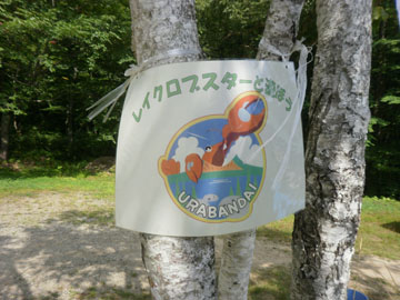 ウチダザリガニは、今から10年ほど前、何者かの手によって小野川湖に放たれましたが、その後、急激に棲息域を広げており、現在、裏磐梯区域内の様々な場所で目にすることができます。大会は、参加者が安全に触れ合えるよう、足場の良好な村有地が選ばれています。会場に近づくと、手作りの看板がお出迎え!