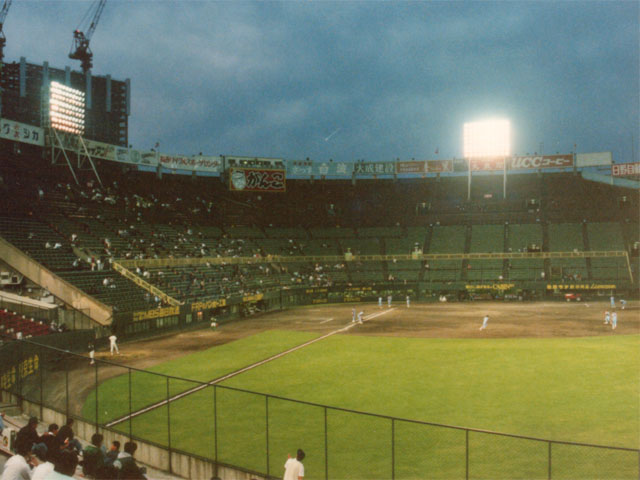 ライト側外野スタンドから見た内野スタンド全景です。こうやって見ると、ホント、内野スタンドがものすごい傾斜だったことがわかりますよね! 夕闇にぼんやりと浮かぶ背後のサウス・タワーホテル建設現場と、ガラガラのスタンドとの対比が、これからホークスが直面する命運を暗示しているように思えてなりません。